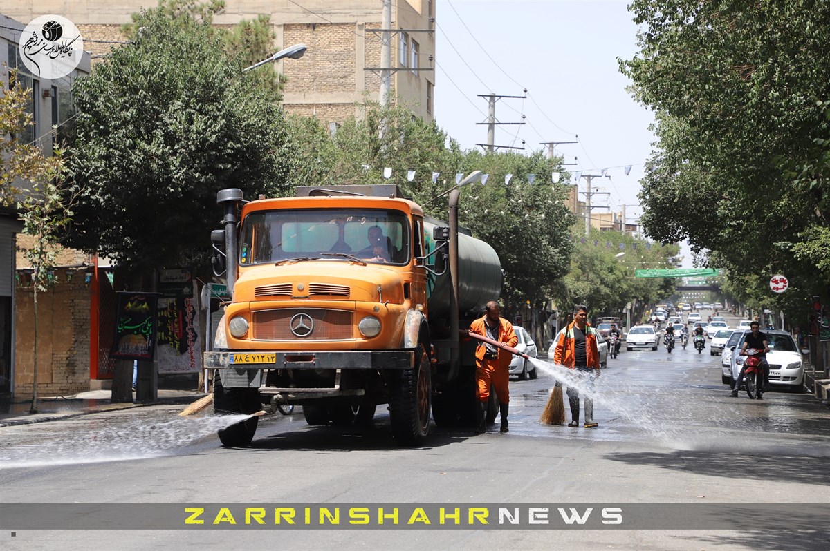 گوشه ای از تلاش کارگران شهرداری زرین شهر جهت پاکسازی معابر شهر پس از عاشورای حسینی